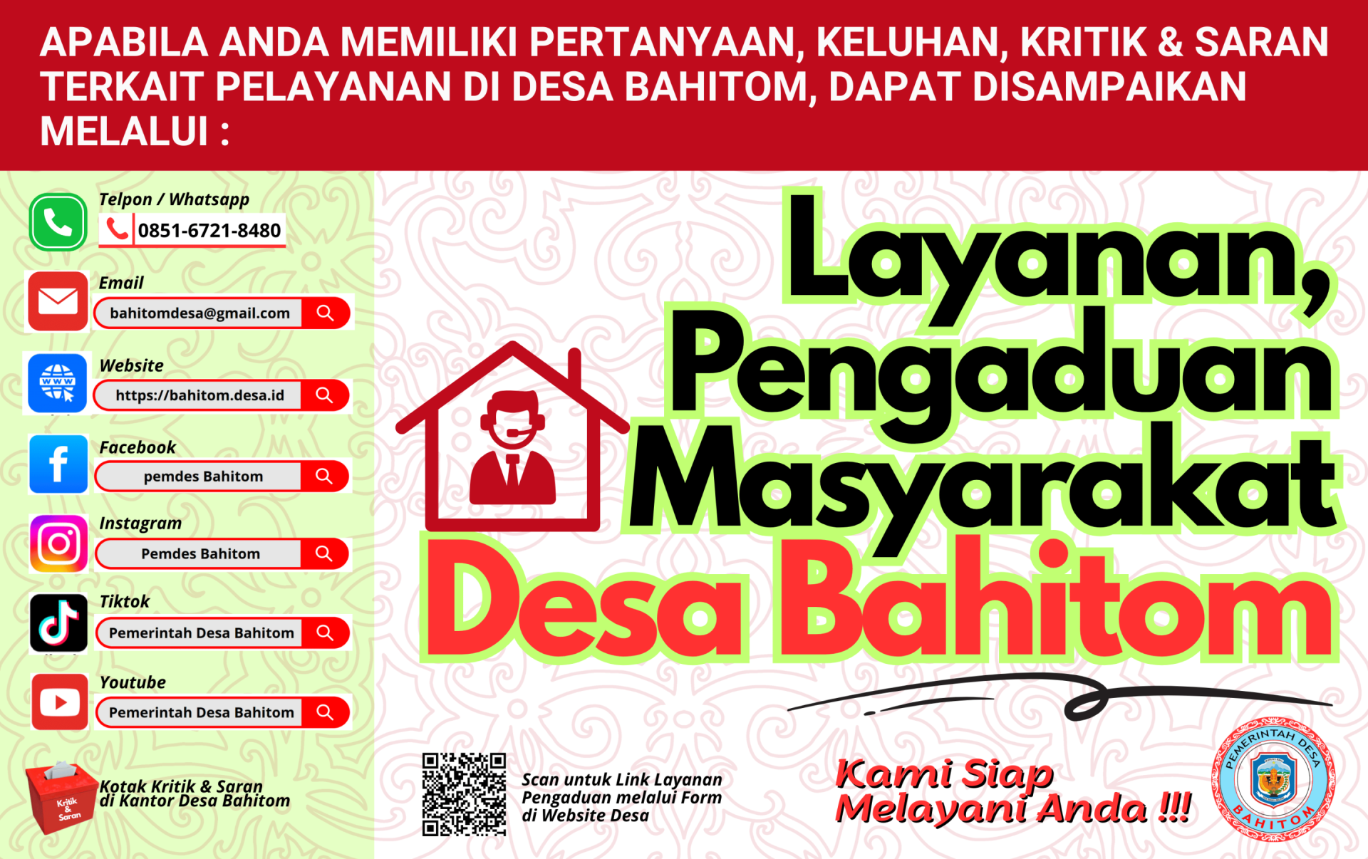 Kami ingin menyampaikan terima kasih kepada seluruh warga Desa Bahitom, para mitra, serta semua yang tertarik untuk mengenal lebih dekat desa kami. Website ini adalah wujud dari upaya bersama kami menghadirkan transparansi dan informasi yang mudah diakses, pelayanan yang berkualitas, partisipasi masyarakat, serta kontak dan kolaborasi. Kami berharap website ini akan menjadi sumber informasi yang berguna dan tempat untuk berinteraksi dengan pemerintah desa.